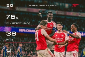 体育资讯3月24日讯 阿森纳官方更新社媒动态,晒出球队本赛季50场比赛的战绩。