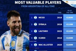 阿根廷历史身价排行:梅西1.8亿欧第一,恩佐第7迪马利亚第10